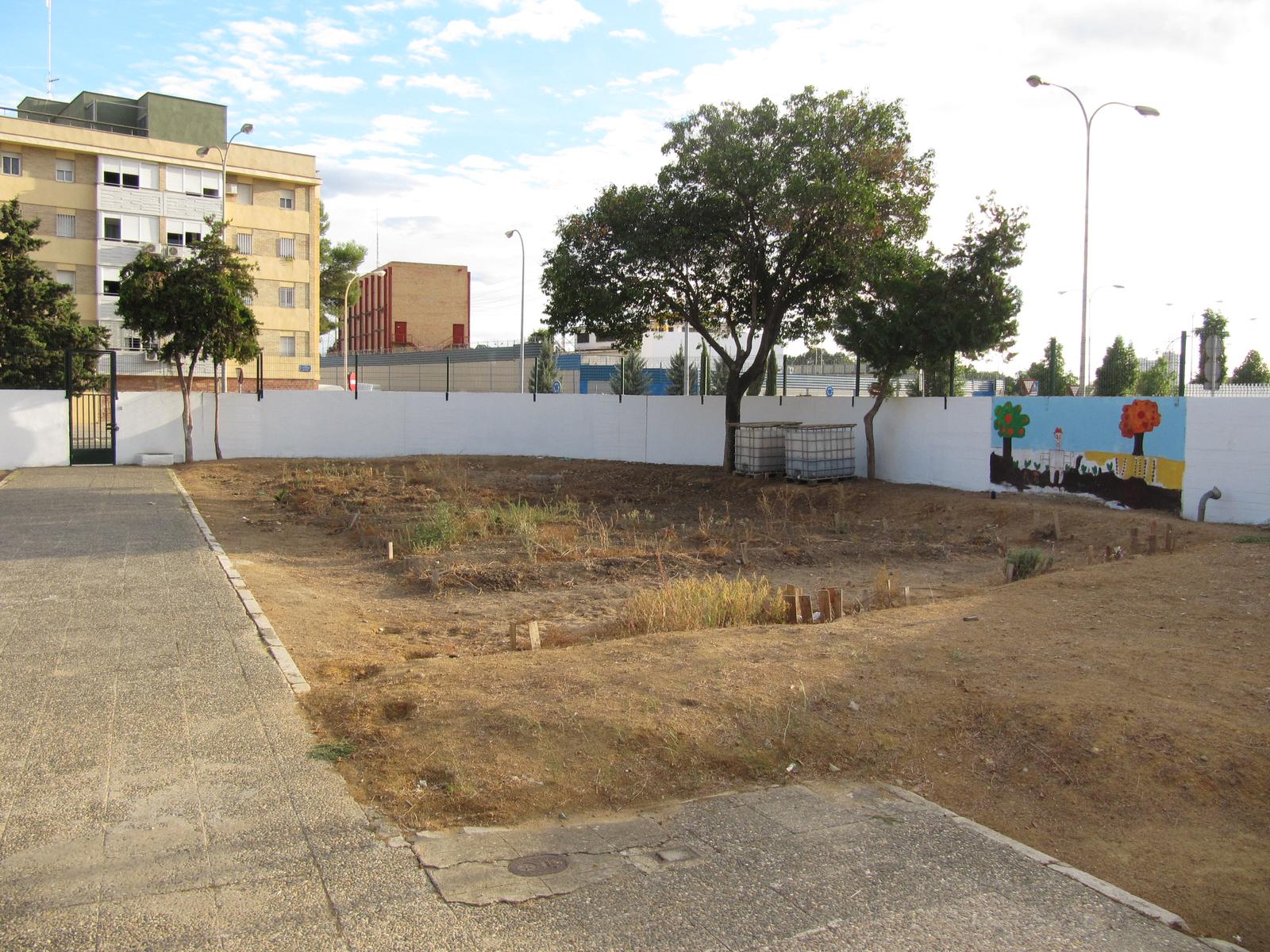 Este es el espacio que nuestro recién estrenado equipo TnT ha elegido para traer armonía, vegetación y color al Colegio de educación infantil y primaria Andalucía. Es un espacio situado al fondo de la entrada del colegio. Tiene unas dimensiones de 14 x 23m. Hay un área central en la que en la actualidad ya existen bancales para sembrar de unos 70 cm de ancho con algunas tomateras y una acelga de tallo fucsia abandonados. Hay cuatro árboles: Un aligustre y varias Tuyas. Existen dos depósitos de riego. El espacio tiene potencial y es valorado y querido por los niños. Aquí está nuestro reto de dotar a esta huerta de vida y actividad.